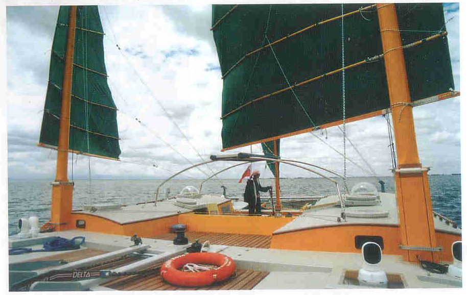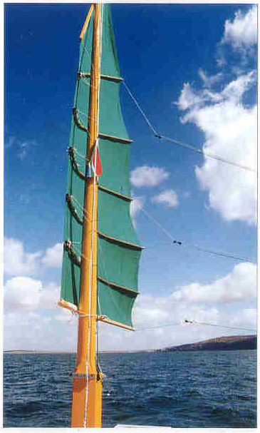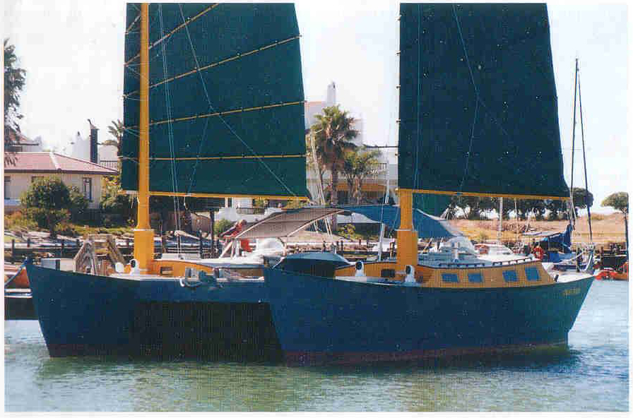 If any other members are planning on putting a junk rig on a cat then I hope they will be encouraged by my efforts — it does seem to work. I would say that two important aspects are keeping the masts well apart. (The centre of each mast is 18’8” apart) and having some shape in the sail.