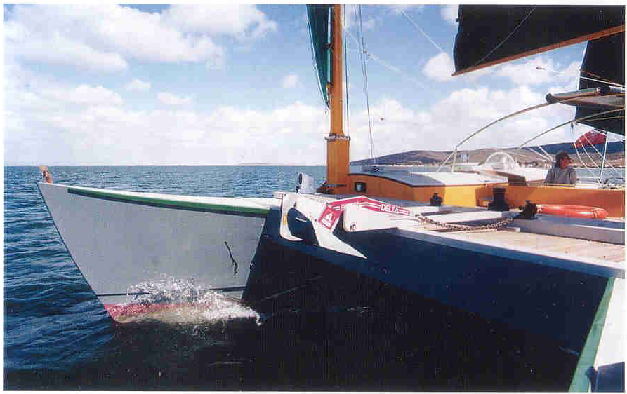 Both sails were pulling well but probably not at their most efficient, as the windward sail was feathered a bit and the leeward one was not in clean air. With the wind abaft the beam both sails were working well and once the wind was on the quarter she more or less steered herself. Sailing at about 4 – 5 knots in a force 3 – 4 wind the sea was flat, so of course the ride was very smooth.