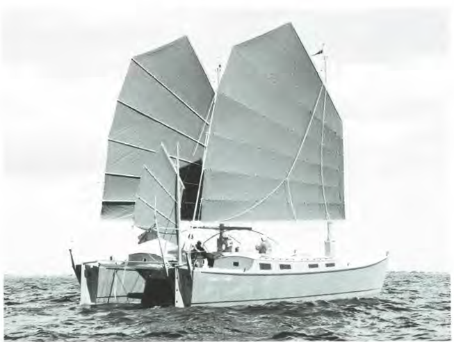 The idea for China Moon first germinated after reading about Dragon Wings, a 34ft catamaran with a junk rig on each hull, in the Junk Rig Association (the nautical equivalent of the Flat Earth Society) newsletter. Combining the best cruising rig with a catamaran was an intriguing idea. The design that evolved was meant to be suitable for high latitude cruising and, hopefully, seaworthy enough to cope with the conditions there. A junk rigged plywood catamaran would not generally be regarded as an appropriate vessel and so it was a bit of an experiment. “A rather expensive experiment,” a friend of mine dryly commented.