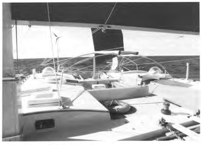 The unstayed masts are held in tabernacles and support a fully-battened rig of 360 square feet. A 27hp Yanmar sail-drive is located in the starboard hull. The hulls are fully insulated with double-glazed hatches and windows. Self-steering is by wind vane driving a trim tab on the port rudder.