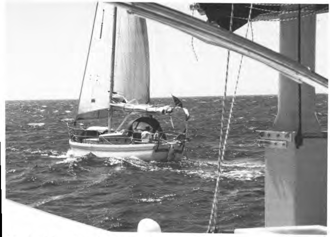 Speedwell had left the day before me but China Moon was sailing at her best in the fresh south-easterly and on the second night out I spotted a white light ahead. It could only be Shirley, so I altered course a little and slowly caught her up. As I passed we exchanged salutations by shining a torch on our sails. The other incident on the passage was when the self-steering got wiped out by an unexpected gybe. It was the middle of the night, of course, and after recovering the pieces it seemed prudent to wait till the morning to try and repair it. Not wishing to steer or slow down I set the sails ’wing and wong’ and let her steer herself, which she did quite well until I fixed the wind vane next morning.