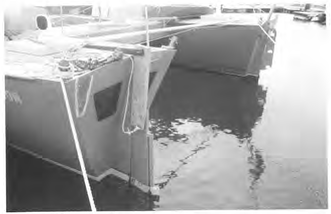 The williwaws were still ferocious and as the water surged in and out of the bay we were banging the rudder and keel of the starboard hull. Not long after the bottom of the skeg and rudder broke off and was swinging about in the water, held on by the middle rope pintles. Things were looking serious and I suggested to Shirley that we pack some survival gear, in case we were forced to abandon. Shirley had already started but had kept quiet about it, not wanting to appear a rat. We had done all we could and now it was time to wait, very frightened as the williwaws continued to hurl themselves at us. We stopped dragging as the tide had dropped and we were grounded on the starboard hull.