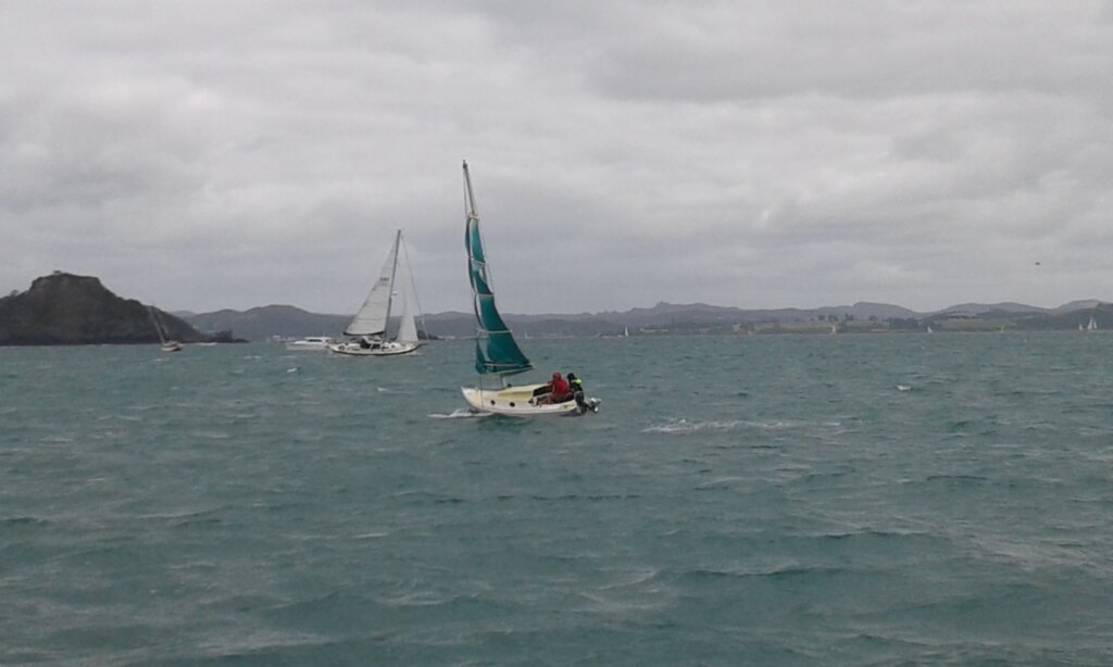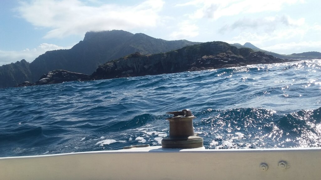 At the crack of the dawn,  with hardly any light to see the shoreline we sailed off the anchor. Out of the well sheltered Whangamumu bay the wind was blowing hard SW5-6 the seas were rough. We already had two reefs and we have not started yet. I was wondering if we should turn back, I sensed trouble ahead and was apprehensive.  We pressed on because the conditions were not unusual for this area and we had to sail there some time. The anchorage we were in had no signal so we had no idea what the weather was going to be like in the next few days.  After a good fast sail to Cape Brett we lost the  wind.  By the time we reached Percy Island, just off the headland,  we were becalmed.
