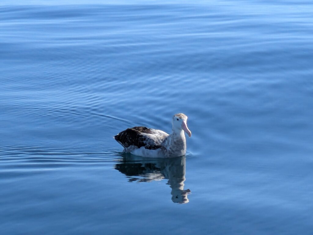 During the following few days the winds were light. Numerous birds flew around us, or just floated on the surface when the wind disappeared. There was no end to our joy when two Wandering Albatrosses (adult and juvenile) continued to follow us, returning regularly to circle us, coming ever closer and closer to the boat. Transfixed, I watched them effortlessly gliding just above the waves, never knowing which sudden turn they might take or where they would surface from. At some point they were flying so close that it looked like they might even fly in between the two masts. In utter calmness, when we covered 29 miles in 24 hours, they just floated with us on oily sea surface, with curiosity examining the boat, and looking at it up from the water, turning their heads, circling us. Only the birds and us for miles on end, endless blue horizon, utter isolation and peace. Immersed in this bliss, with no care for the world, we sailed or drifted totally absorbed by the sky, tiny little ripples on the sea surface waiting for the wind that might come. I even whistled calling for it to come, but be careful what you wish for.