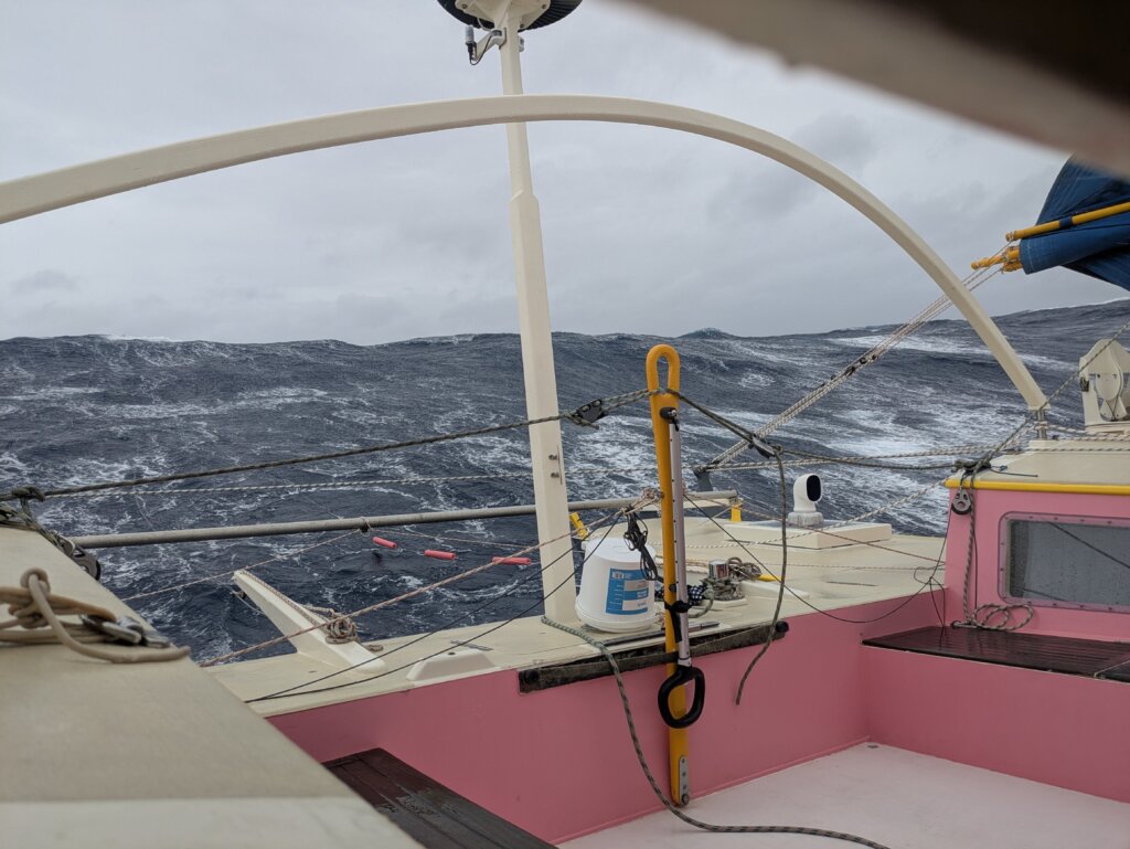 As the winds were so light – we were making 30 – 50 – 70 miles a day. I was getting curious how long these light winds were going to last. The horizon/skies and waves seemed not to give us any clues about the change to come. I requested an InReach weather forecast and got an instant shock. 40+ knots winds were forecasted in a day or so. Oh, that spoiled it all. From then on all bliss was gone from my world, full of anxiety, I waited for the bad weather to come, knowing that it made it even worse. I wished I never pressed that InReach button.