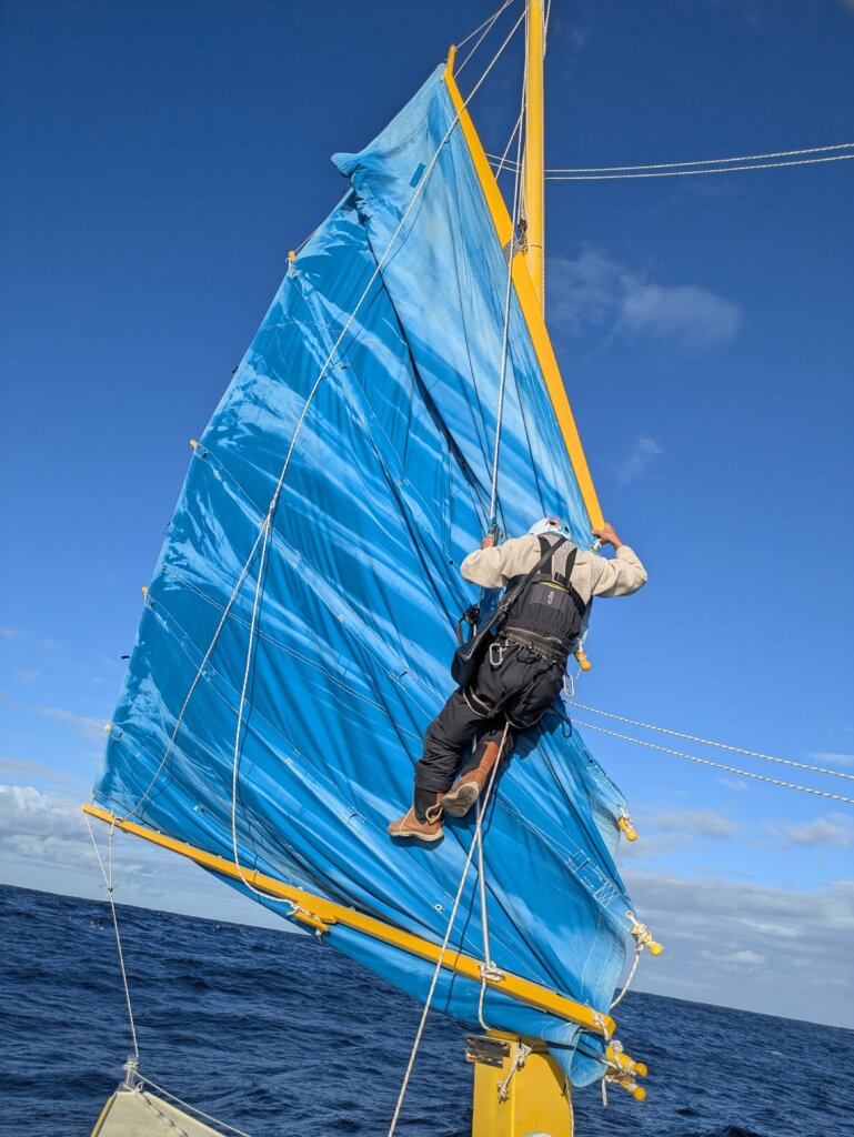 Late afternoon, I was just getting up from my nap, thinking of what to cook for dinner when I noticed that Neptune was unusually busy in the cockpit. Still in the pyjamas I stepped out in haste, wanting to understand what was going on and to help. I took the helm but surprisingly could not steer well. Neptune was in the process of gybing the port sail and swapping the wind vanes over, which on China Moon is relatively simple manoeuvre. Not so this time. To my amazement, within seconds first the port sail went completely up the mast, dropped and then the starboard sail did the same, but this time it didn’t drop, something I had never seen before. All was well for a split second. I turned round, to be stunned by the starboard sail lifted up high, its top panels hooked on the top of the mast. Alarmed, I looked in disbelief at what we were seeing. Who and how is going to undo this in the middle of the ocean, with a far from flat sea. The uncontrollable sail was dangerous and could not be left like that. It had to be fixed before the wind picked up and before dark.
