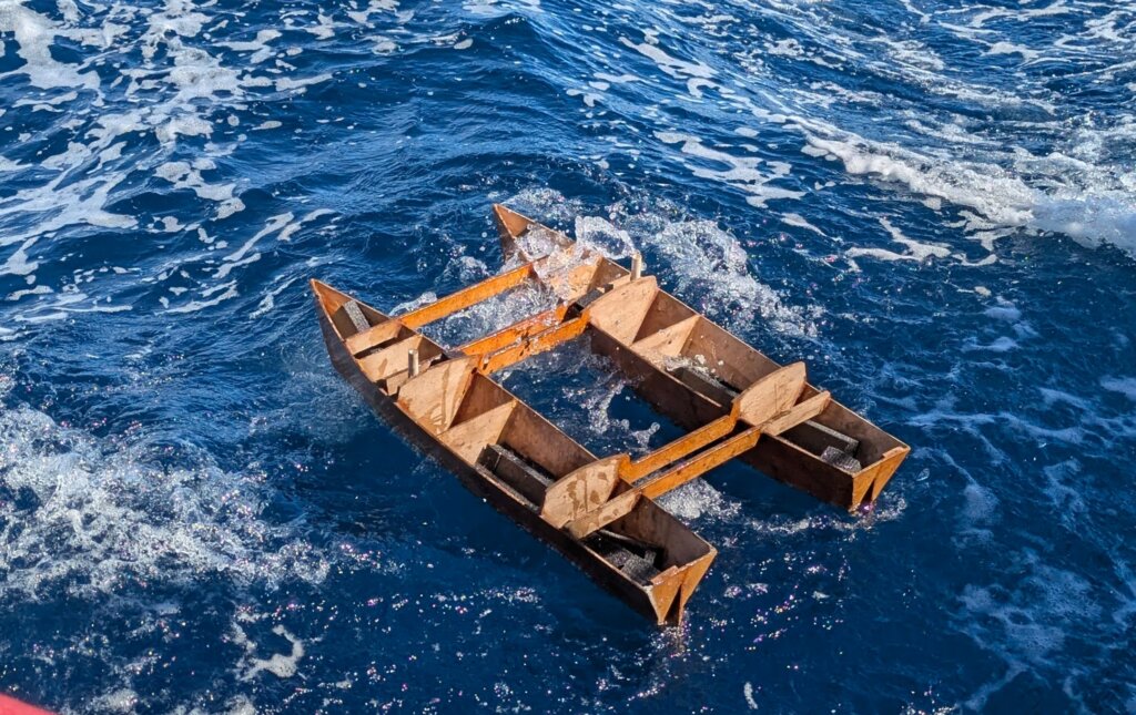 Upon designing China Moon, Neptune made an exact model of it to test if the bi-pane catamaran will work with a junk rig. That model survived all these years later, because Simon kept it at home. On our departure from Tasmania Simon presented it to us. I was thrilled to see it and gladly accepted to take it. I felt it was not right for the model to continue collecting dust while the real China Moon was sailing the seas. I suggested to Neptune that we launch her during our Tasman crossing. To ensure that she could float for at least for a while, I filled and glued her hollow hull with a polyethylene foam. We decided to launch it on our 2nd day of the passage, in moderate seas. As we carefully dropped it into the sea, it slowly floated away, unsure of its fate. Standing there looking at it, unsure of its fate, I felt there was something ominous about it.