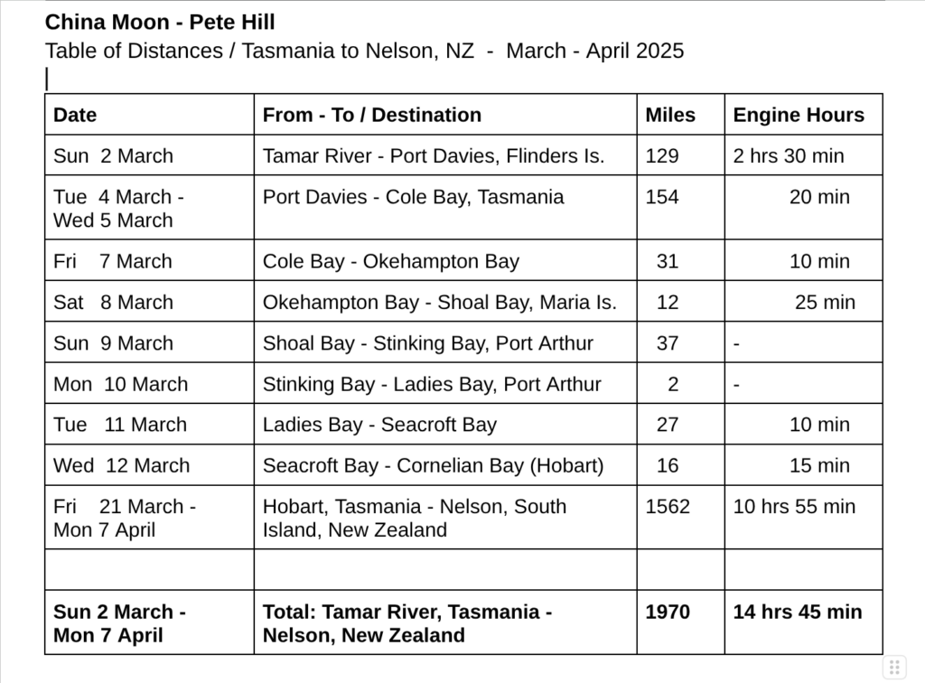 We survived. Were it not for Neptune’s (Pete’s) extraordinary seamanship, China Moon’s seaworthiness plus my indispensable endurance (notice this self affirmation) we might not have been here today. It certainly seemed to be ‘touch and go’ at times.