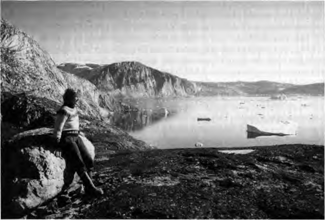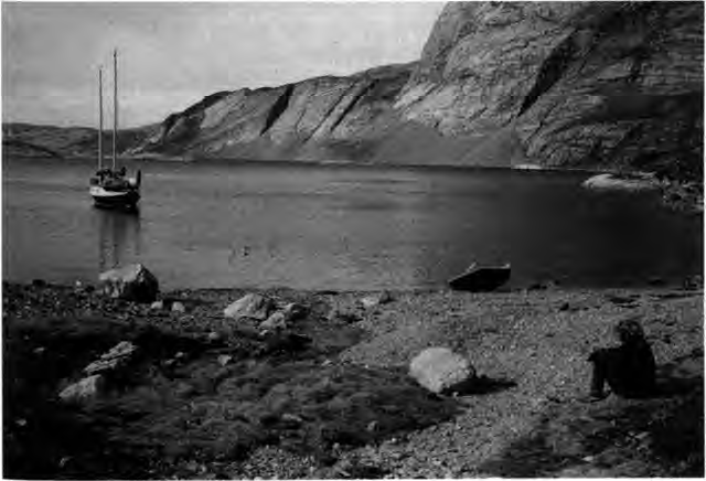The best way to find an anchorage seems to be to look for a river or stream on the chart and hope that it has left sufficient silt to fill up the bottomless fjord and so give a reasonable depth to anchor in. However, our echo sounder, rather a Mickey Mouse job, only read to 24 metres with deeper water shown by a second revolution. The trouble was that with a rock bottom, two times around the scale looked just the same as once around with 116 Annie looking east from Agpat island, Uummannaq fjord a soft bottom. Many’s the time when we didn’t know if we were in 15 metres or 39 metres, the difference between a possible and an impossible depth in which to anchor.