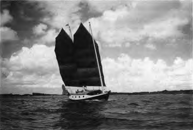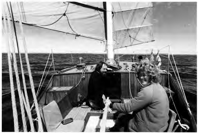 Our home for the past eight years has been Badger, a 34 ft double-ended dory, designed by Jay Benford. The hull is cold-moulded plywood covered with glass cloth. The decks, however, are sheathed in teak to save us the trouble of painting them. Slung beneath her flat bottom is a Collins tandem keel, giving a draught of 4 ft 6 in, and a skeg-mounted rudder. Badger is rigged as a Junk schooner, surely the finest shorthanded rig. While Badger is not everyone’s ideal ‘proper yacht’, we are very fond of her and she has taken us wherever we have wanted to go with a fair measure of comfort and alacrity. Best of all, Badger is fun to sail.