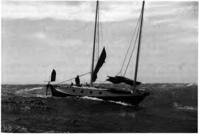 The wind stayed in the north-west for several days, blowing at force 4 or so and giving us good runs as we were now ‘running our easting down’. Eventually, it went round to the south, then quickly through east and back to the north. As the barometer started to go up, the wind backed round and then blew hard from the south-east, with a high glass. The wind kept up for the next four days, reaching gale force at times. The seas quickly grew and it was a very uncomfortable time aboard Badger. We continued on our way, most of the time reefed down to the top panels of each sail.
