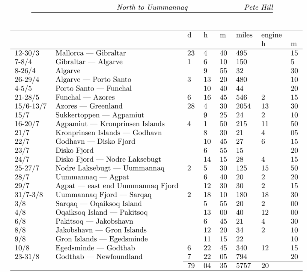 After a happy two week stay we sailed to Ponta Delgada in the Azores. We had originally intended to see more of the Azores, but when the wind served we were in the middle of some job or other and when we were ready, the wind would have been right on the nose, so we stayed put. Here Annie did her sums on the back of an envelope and bought prodigious quantities of potatoes, onions, carrots, cabbage and garlic. ‘Enough to see us to Canada’, she announced — and she was right. The plan was to head north west, skirt the iceberg limit off Newfoundland and sail direct to Disko Bay. By leaving from the Azores we hoped to go across the grain of the depression tracks and perhaps have less bad weather and more fair winds. The plan worked well and we had a good passage as far as the Labrador Sea. There the wind deserted us and we crawled north at a snail’s pace. We stayed at least 120 miles off the south-west coast of Greenland and avoided seeing any ice until we reached 62°N. Seeing my first iceberg loom out close at hand through the fog certainly got the adrenalin flowing — I put in a lightning tack to avoid it and then realised that it was at least half a mile away. Annie’s experiences were obviously similar. I quote from the 0245 log entry from a few mornings later: