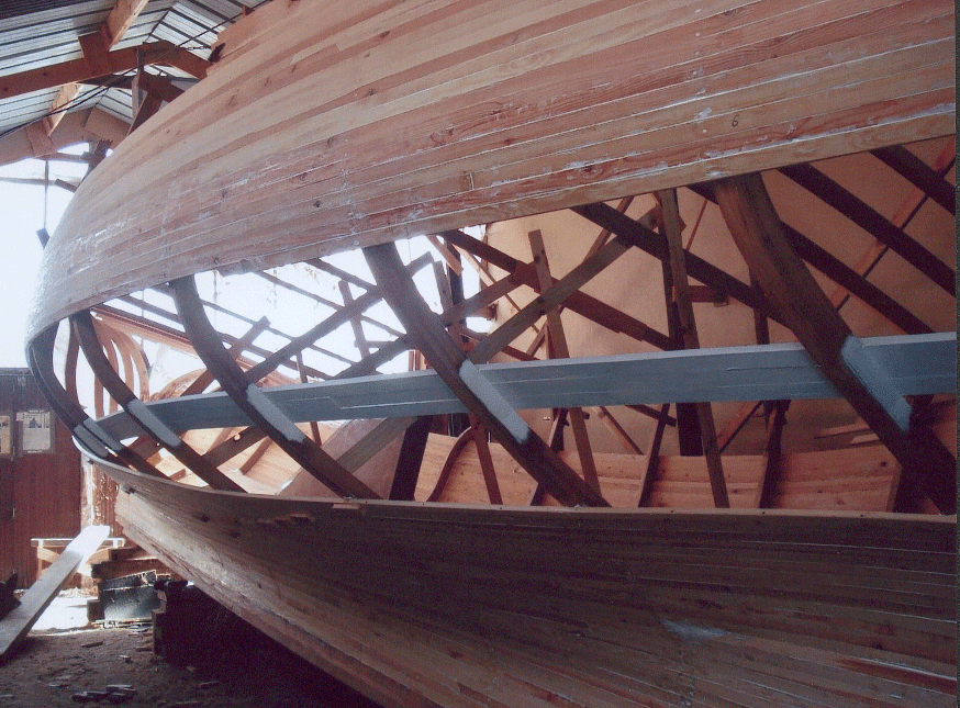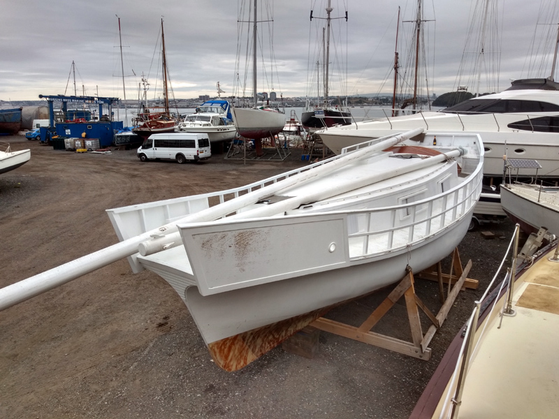 It took three years from the boat arriving in Southdown until launch day, working 7 days a week, 10 hours a day, two of us for over two years. On the last year we allowed ourselves Sundays off. For the original build Mr Fabrice took 7 years, but part time. Our workshop was a shed constructed over the cockpit, and to everyone’s amazement, not least ours, it survived for three winters of gales. The materials were stored under the boat, inside it or in the shed.