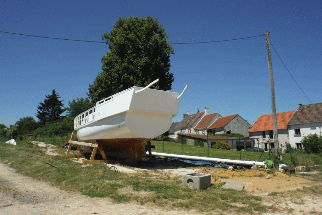 Kokachin, originally named Matahina, started her life on a farm in Bussieres, a little village 70km NE from Paris. Her hull and deck and some of the interior were built by Mr Jossete, a professional carpenter. He started building her in 2009 and spent two years building the hull alone plus many more on the rest of the boat. Last work he did was in 2016 . He moved away from the area, realising that he would not be able to complete her. Via a grapevine we heard about her being for sale on LeBonCoin in France.
