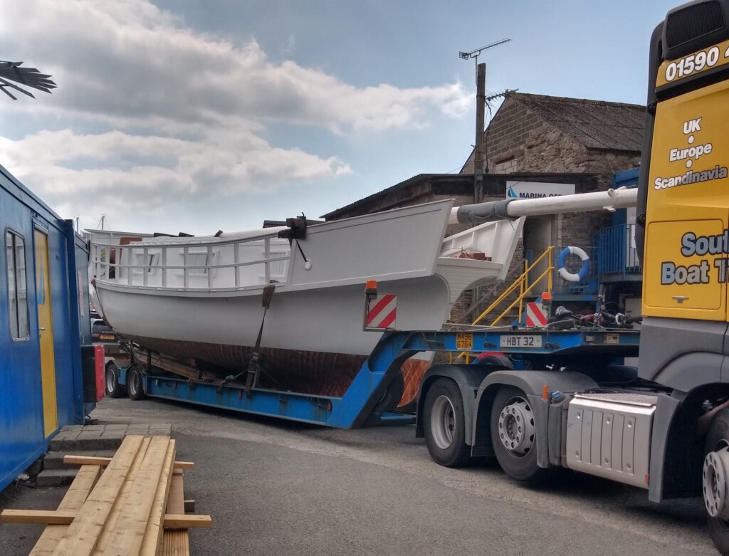 Quite unexpectedly on returning to Plymouth, we heard about a partially completed Forestier 12.5 junk for sale near Paris. This seemed too good an opportunity to miss: while we were looking forward to cruising again the Forestier would be a much more suitable cruising home for us both. We flew over to take a look, bought her and then arranged her transport back to Cornwall. It sounds simple, but entailed a few nail biting weeks while Linda coordinated English transport, a French crane and lastminute document delivery to France. After that was organised we had a few weeks to wait and so sailed in Blossom to Falmouth and then on to the Scilly Isles, having a delightful holiday. Once back in Millbrook we hauled Blossom out at Southdown Marina and when our new boat, Kokachin, arrived, she was placed alongside Blossom. As work progresses on Kokachin we can live on Blossom, a three step commute away. When we finally move aboard our new boat, Blossom will be for sale.