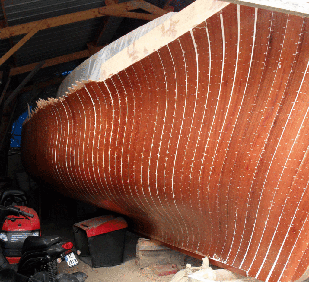 The cabin sides were made of edge glued planks of maritime pine wood which we covered with 6mm marine plywood and then epoxied.