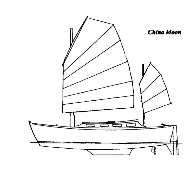 China Moon was designed and built as a seaworthy ocean cruising home for short handed sailing. The unusual double junk rig provides for safe and easy handling. Sails can be hoisted and reefed from inside the cuddy without getting wet. Hinged carbon fibre battens give the sail a good shape. As well as her superb off wind performance she also sails well to windward and tacks easily,