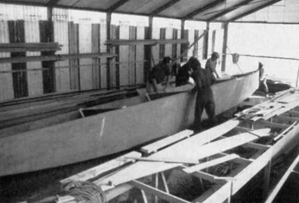 The hulls were dory shaped with flaring topsides and the hulls were built in two halfs.