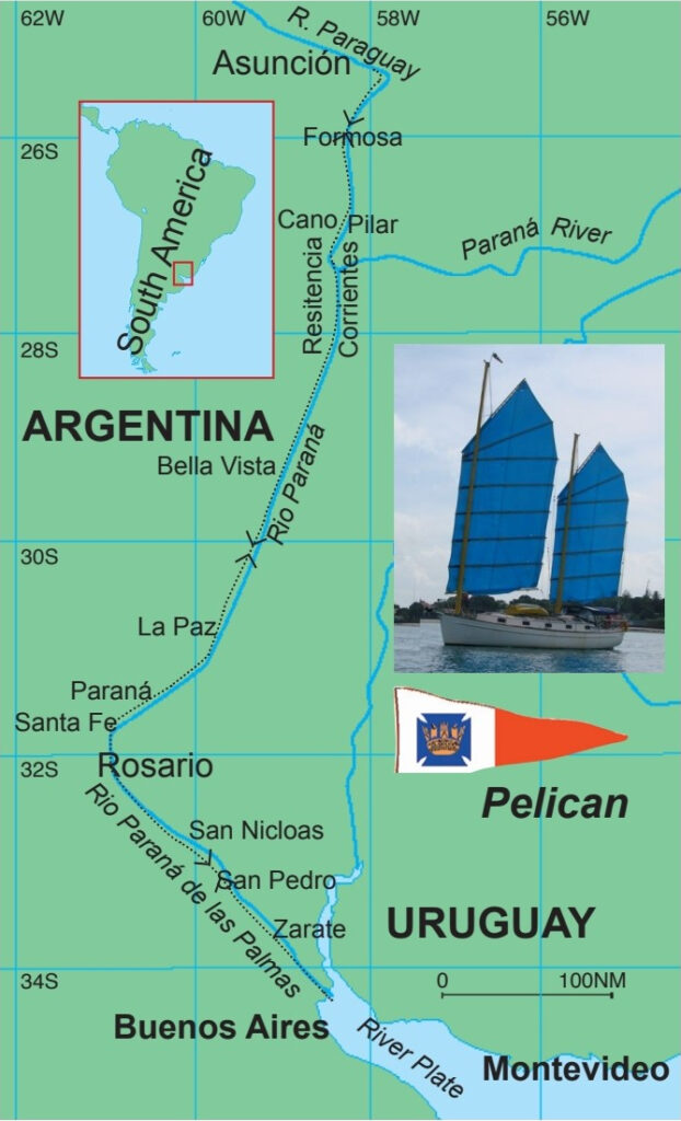 For someone who dislikes motoring it may seem a little perverse to attempt to go a long way up the rivers Paraná and Paraguay, but the prospect of being able to travel 1,000 miles into the centre of a continent without taking the masts down was irresistible. My only source of information was the Admiralty pilot, which suggested that the river was lowest and hence the current least (about 2 knots) in the southern winter.