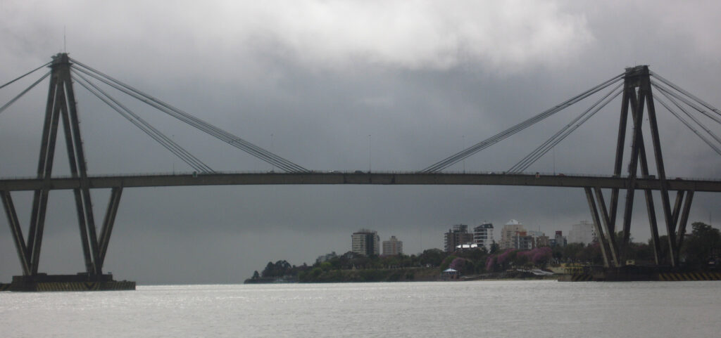 On leaving the club we passed under a magnificent new suspension bridge, leaving behind sea going ships with now only barges to be seen. There was some Argentine and even Brazilian barge traffic but it was mostly Paraguayan, the river being their major import and export route. On average two or three barges a day passed each way. They consisted of a pusher tug and up to 15 large barges lashed three abreast. The tugs drew just under 3m, twice our draught. Navigation became more difficult as we were using the one-year-old latest edition of a book of chartlets. The chart plotter still showed the river, but no details or soundings and we were often travelling overland. Buoys were few and far apart. In many places there were low islands and some confusion as to which channel to take.